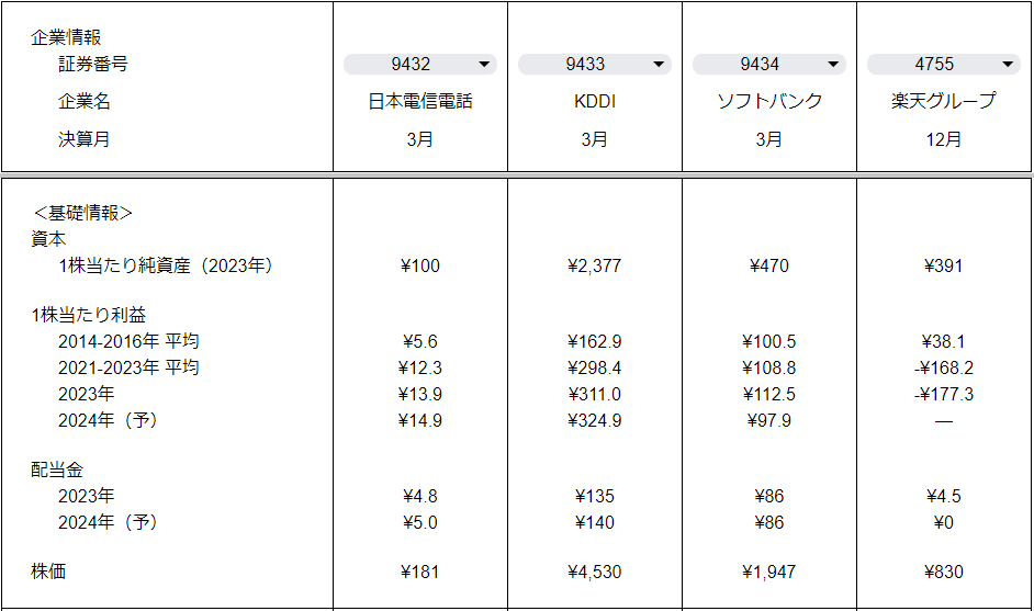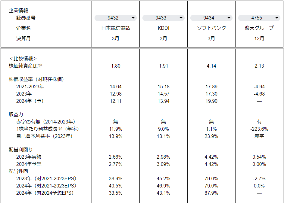 まず目につくのは、日本電信電話とKDDI、ソフトバンクの1株当たり利益(EPS)は比較的堅調であるのに対して、楽天グループは2023年も2021-2023年の平均も赤字となっている点です。1株当たり純資産が391円に対して、2023年は1株当たり177円の赤字なので、実に純資産の30%程度を失うことになっています。2024年の業績予想もおそらく見通し立たずで非公開です。配当金についても、楽天グループのみ無配です。