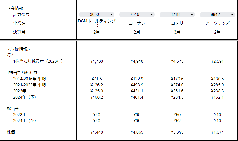 今回分析対象とするのは、「DCMホールディングス」、「コーナン」、「コメリ」そして「アークランズ」です。